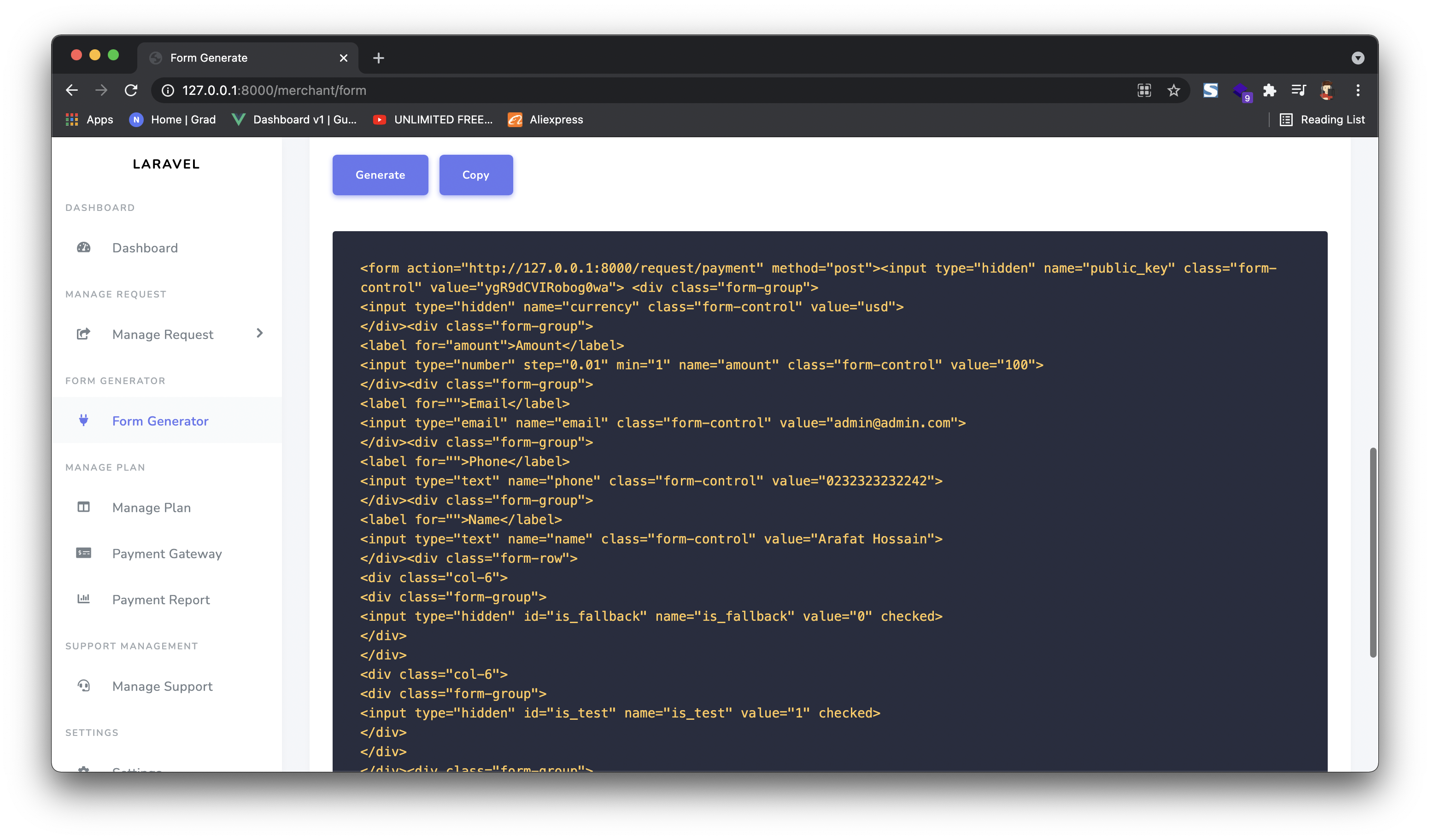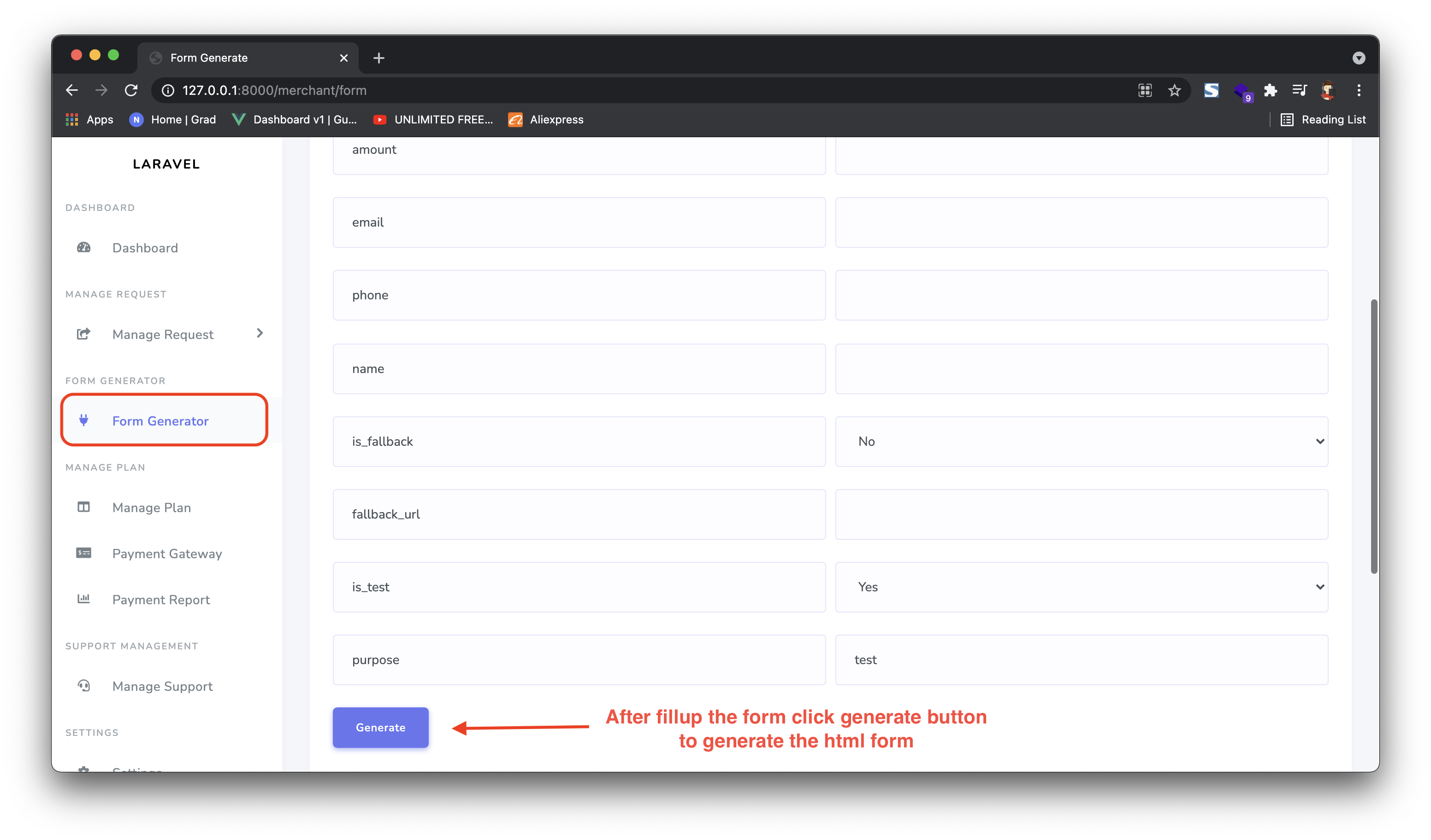 To create the html form for users click form generator from the side menu then fill up the desired values if necessary. Then click on generate button.